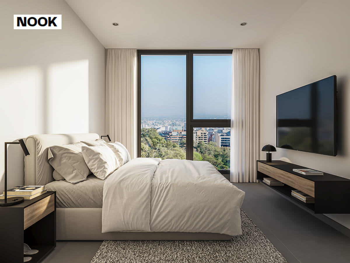 Ubicado en Av. Centenario 2400 (San Isidro), NOOK es un edificio de 9 pisos que ofrece 72 unidades de 2 y 3 ambientes, todas con balcón y parrilla. Su gran diferencial es la incorporación de tecnología de punta para el confort diario: cuenta con cerraduras digitales (huella, código, tag), acceso peatonal con reconocimiento facial, luces LED embutidas y calefacción por losa radiante digital.