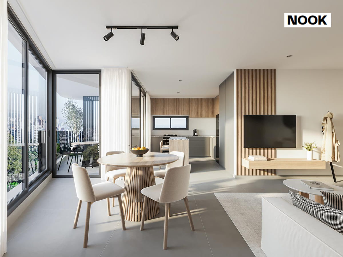 Ubicado en Av. Centenario 2400 (San Isidro), NOOK es un edificio de 9 pisos que ofrece 72 unidades de 2 y 3 ambientes, todas con balcón y parrilla. Su gran diferencial es la incorporación de tecnología de punta para el confort diario: cuenta con cerraduras digitales (huella, código, tag), acceso peatonal con reconocimiento facial, luces LED embutidas y calefacción por losa radiante digital.